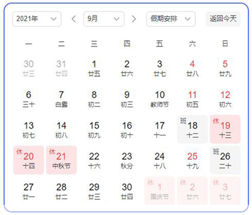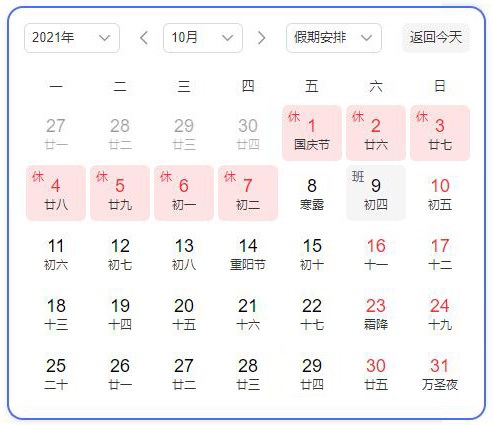 2021年10月1日(星期五)至10月7日(星期四)放假調(diào)休,共7天,